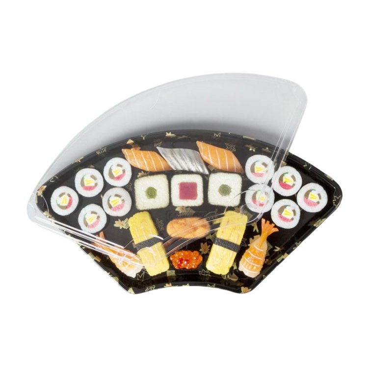 Item: Fan-shaped disposable Japanese sushi tray pack packaging plastic envases takeaway black container to-go box with lid